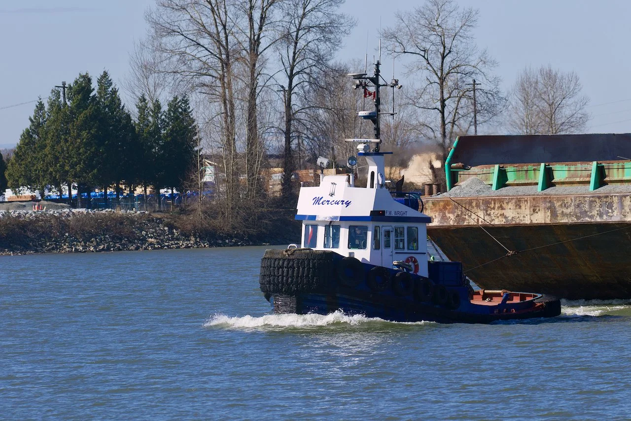 Mercury Launch & Tug tugboat “F. W. WRIGHT” tows barge in the Fraser River, B.C., March 9, 2022.