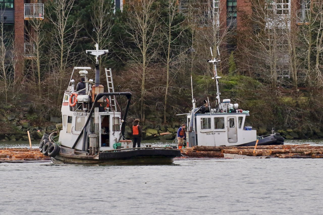 Valley Towing tugboat “SEA CAP VII” and Catherwood Towing tugboat “SEA IMP IV” guide a log boom in Fraser River, New Westminster, B.C., January 27, 2026.