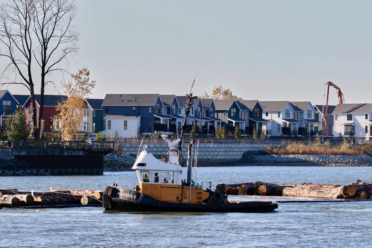 Harken Towing tugboat "HARKEN 6" guides log boom in Fraser River, New Westminster, B.C., November 17, 2022.