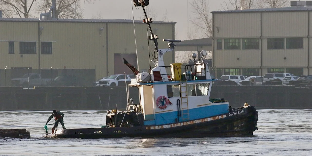 Tugboat Hodder Star (fmr. River Star) attaches a log boom using a hook, Fraser River, Annacis Island, Delta, B.C., February 5, 2026.
