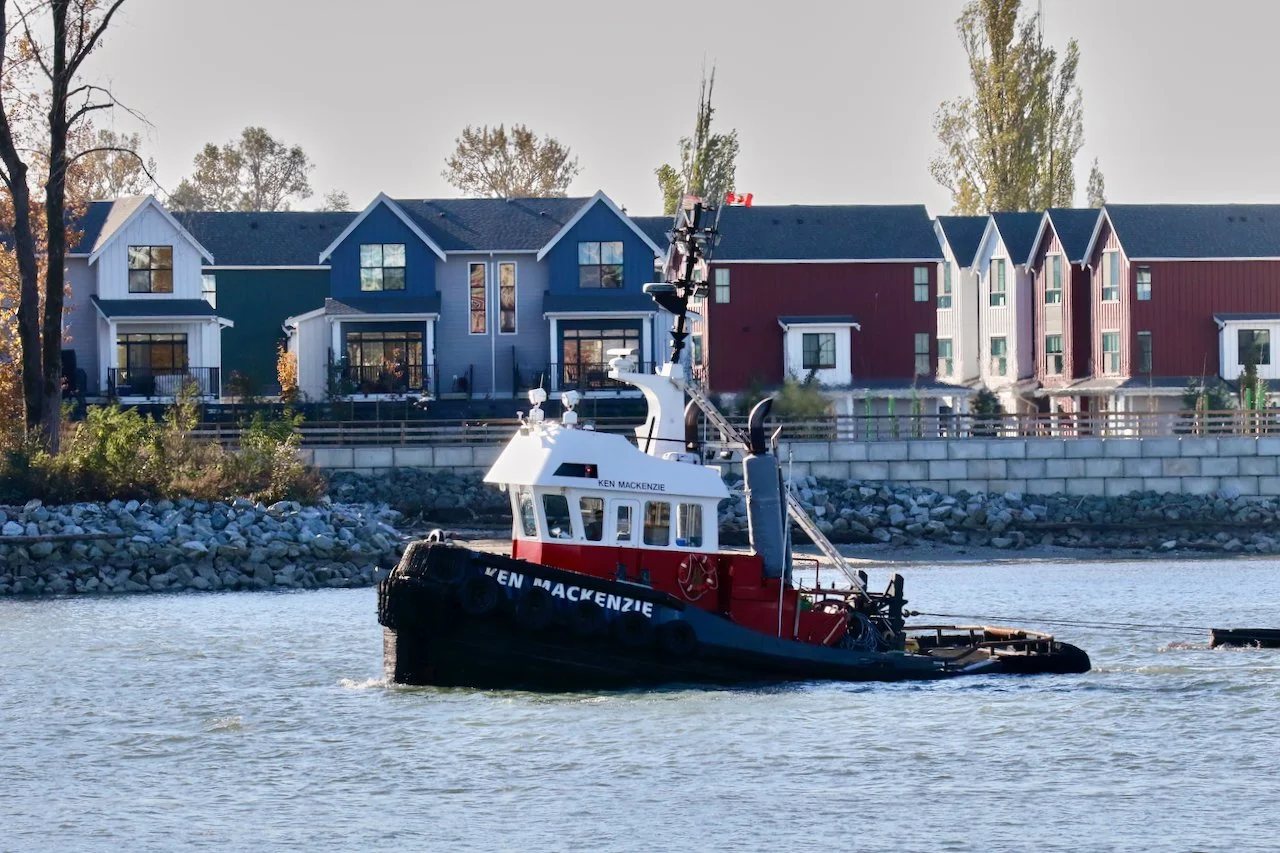 Harken Towing tugboat "KEN MACKENZIE' tows log boom in Fraser River, New Westminster, B.C., November 17, 2022.