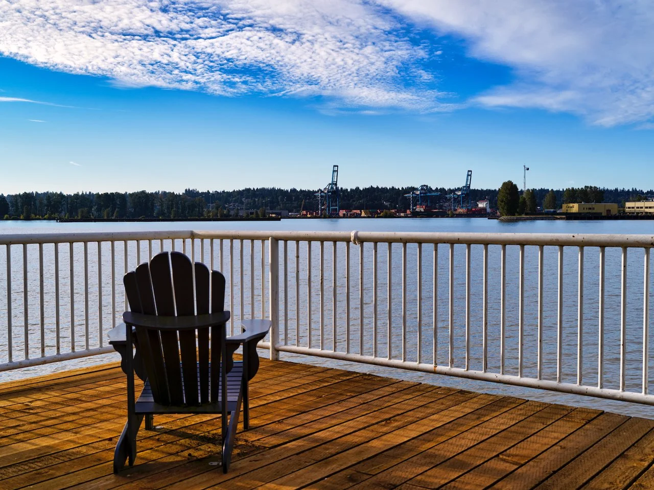 Chair by the Fraser River in early morning sunlight, New Westminster, B.C., August 14, 2022.