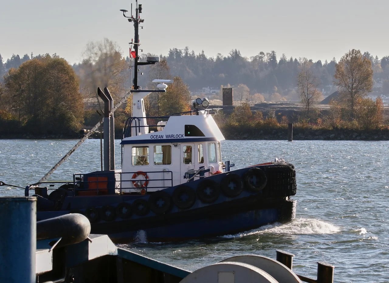 Mercury Launch & Tug Ltd. tugboat “Ocean Warlock” (previously named “El Toro”) heads down the Fraser River at New Westminster, B.C., November 17, 2022.