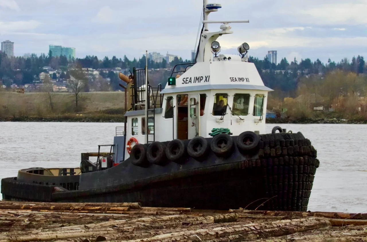 Catherwood Towing tugboat “SEA IMP XI” guides log boom in Fraser River, B.C., December 1, 2021.