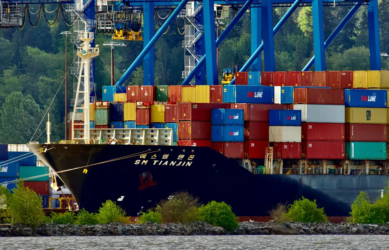 Bow of container ship SM Tianjin at DP World Fraser Surrey Terminal, Fraser River, Surrey, B.C., May 19, 2022.